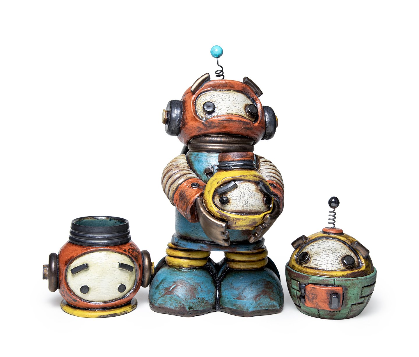 Now that is the most fun-looking body of ceramics that we’ve seen in a looong time. These nostalgic, weathered, 1950ish cartoon-looking robots are just what I needed - when I didn’t even know that I needed it. Sometimes, humor in art is overlooked and disregarded when it should be promoted and praised. Leo Rosten once wrote that "Humor is the affectionate communication of insight," and knowing when you need a lift - is pretty good insight in my mind. And that’s especially true when it’s done as skillfully and as well thought out as these pieces by Michael Klapthor are.