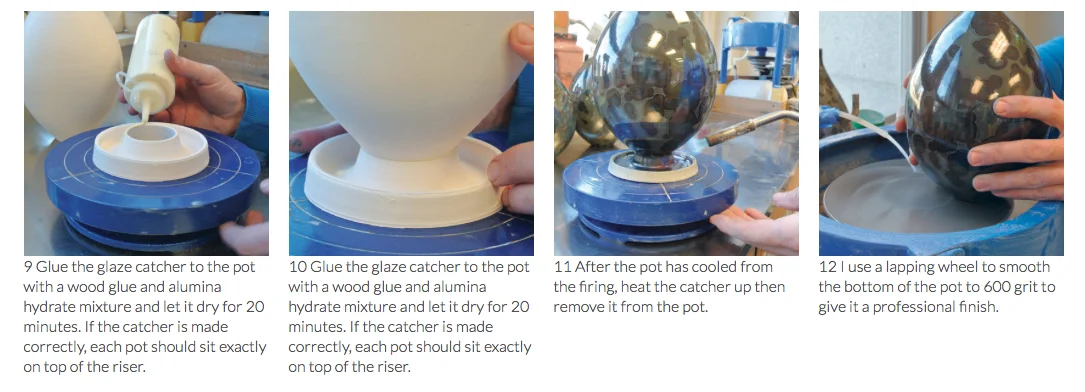 The catchers and the pots are glued together, after each are bisque fired, with a mixture of wood glue and alumina hydrate (9, 10). Mix the glue with the alumina until it starts to thicken and won’t run down the riser when gluing, but not too thick that it won’t absorb into the clay a bit. The wood glue only serves to bind the pieces together for the purposes of glazing and loading. During the firing the wood glue burns away leaving a small gasket of alumina hydrate that helps separate the catcher from the pot.